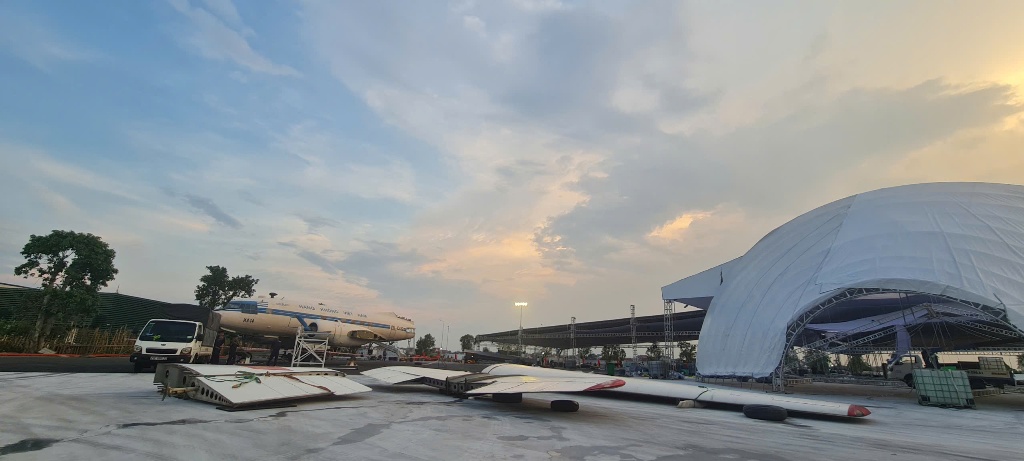 Đêm qua (14/8), mưa lốc lớn đã làm một phần nhà giàn tại khu trưng bày bị hư hại, ảnh hưởng đến công tác thi công và tiến độ hoàn thành gian triển lãm của Cục Hàng không Việt Nam.
