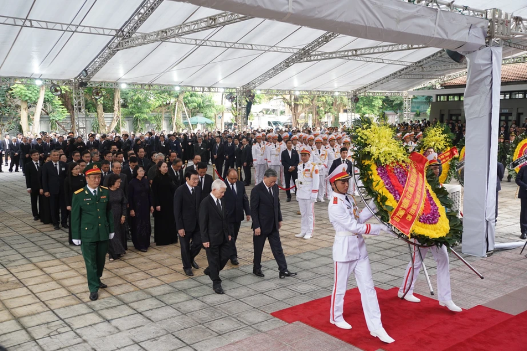 (Đoàn Ban Chấp hành Trung ương Đảng Cộng sản Việt Nam do Ủy viên Bộ Chính trị, Chủ tịch nước Tô Lâm dẫn đầu, vào kính viếng Tổng Bí thư Nguyễn Phú Trọng).