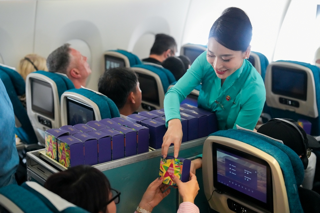 Trong khi đó, hành khách hạng Phổ thông có thể lựa chọn các hương vị kết hợp giữa truyền thống và hiện đại như trà xanh Ngọc Châu, sen Huế lá dứa, đậu xanh sầu riêng trứng muối...